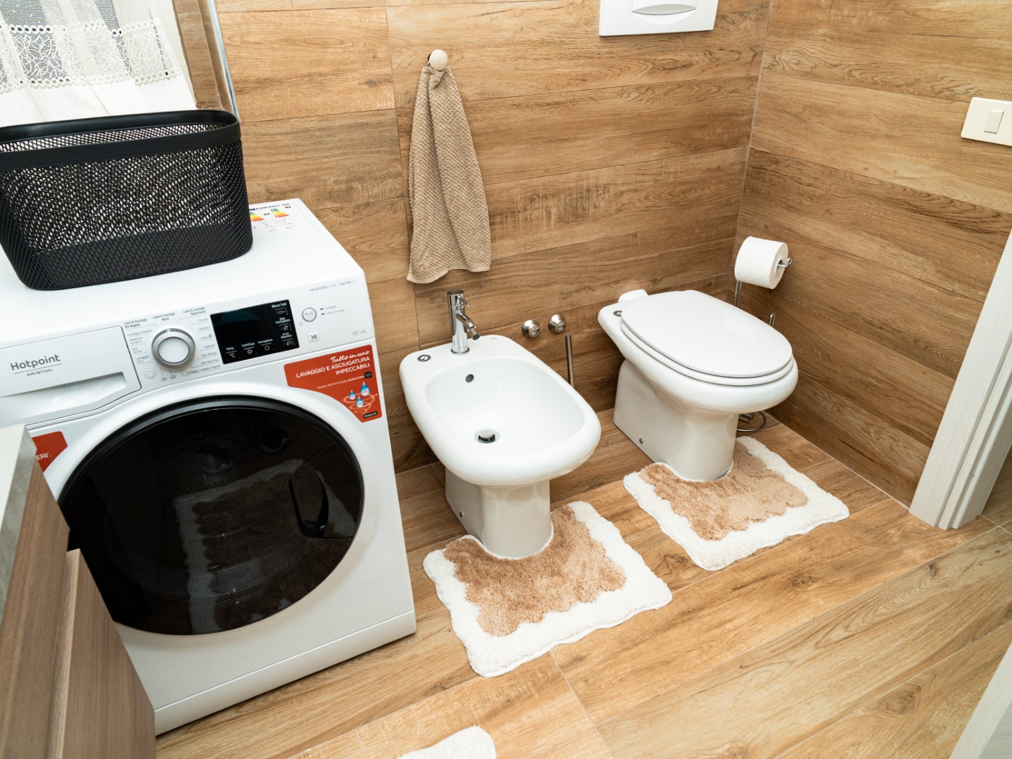 Bagno moderno con doccia, asciugacapelli, lavatrice e asciugatrice. Tutto il necessario per un soggiorno comodo e indipendente.
